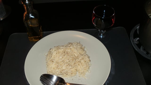 Ajouter peu à peu le pecorino moulu (1 tasse au total) et verser l'eau de cuisson peu à peu sans cesser de remuer. Les pâtes doivent s'enrober d'une sauce crémeuse (pas trop liquide).