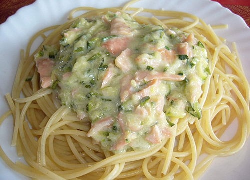 Ajouter cette sauce aux courgettes et ajouter le saumon fumé coupé en dés.