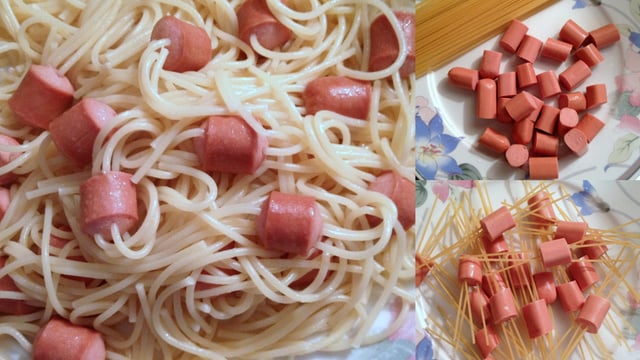Maintenant il suffit d'enfiler les spaghettis dans les morceaux de knaks.