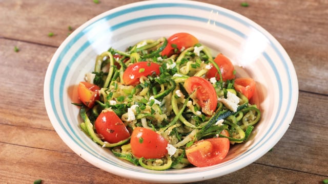 Versez 2 cuillères à soupe d'huile d'olive dans une poêle et râpez une gousse d'ail au dessus de la poêle. Faites chauffer sur feu moyen et faites revenir l'ail pendant 30 secondes. Ajoutez les spaghettis de courgettes et faites-les revenir sur feu vif pendant 2 minutes. Les spaghettis doivent être encore croquants.