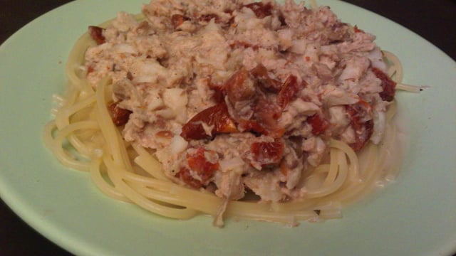 Emietté le thon grossièrement et ajouter le à la préparation. Faites bouillir 1 mn, salé, poivré. Verser les spaghettis à la préparation en ébullition puis réduisez le feu.