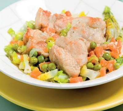Ajouter les petits pois et la sucrine coupée en fines lanières, couvrir et poursuivre la cuisson 10 min encore (les petits pois doivent rester al dente). Servir chaud.
