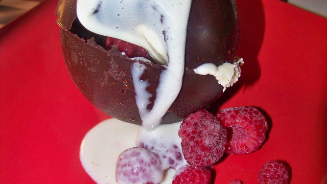 Remplir à la dernière minute les demis-sphères d'une boule de glace vanille, par dessus mettre des framboises et fermer la sphère en une boule en chauffant légèrement le dessous de la sphère pour coller les demies sphères entre elles.