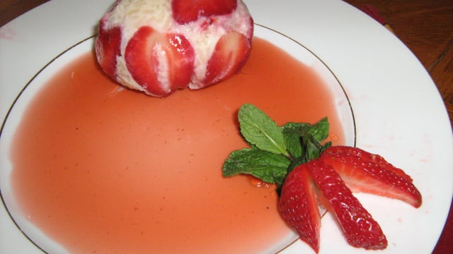 Dans le jus de fraîses restant, ajoutez la même quantité de gélatine restante, nappez le fond d'une assiette et faire prendre au frigo, au môment de dresser posez votre sphére entiére où coupée en deux, et agrémenter à votre idée, soit d'un coulis de fraîse servi à part où de fraîses natures.