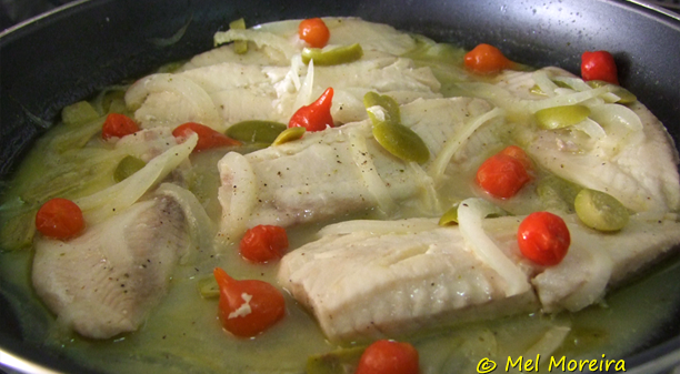 Huiler un plat allant au four et étaler les filets au fond, couvrir avec l'oignon haché et les olives. Verser le lait de noix de coco, le vin blanc, les piments et saupoudrer de poivre.