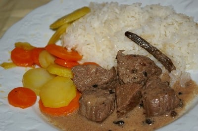 Dés de steack marinés au poivre vert et vanille puis poêlés, déglaçage au bouillon vanillé et à la crème. Rapide, et inoubliable!