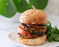 Pour le burger : Faites griller le pain, mettez un steak, des légumes, des sauces, un deuxième steak et servez avec une salade.