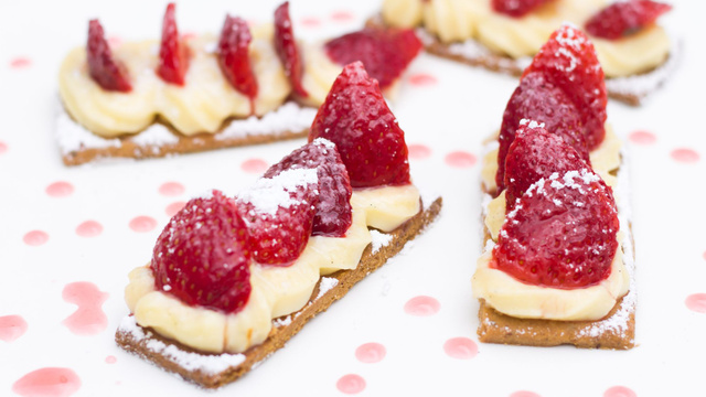 A la façon d"une tartelette sablée à la fraise, ce stick se mange sans couverts, idéal pour un cocktail ou un café gourmand.