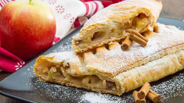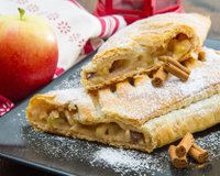 Humecter les bords avec le blanc d'oeuf, enrouler le strudel appuyant la partie de la fermeture sur le fond de la plaque à four, sceller bien les bords, pinçonner avec du beurre fondu.