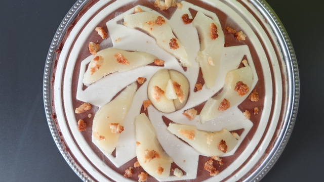Afin de faciliter le démoulage, passez un sèche-cheveux ou un torchon imbibé d'eau chaude autour du cercle pour le décoller de l'entremets. Décorez avec des morceaux de poires. Ecrasez, avec un rouleau, les chutes du biscuit et parsemez-les sur le gâteau.