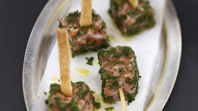 Sortez les cubes de saumon de la marinade, passez-les dans le cerfeuil haché. Incisez légèrement chaque morceau de saumon, plantez un bâtonnet de feuilleté dans chaque. Servez aussitôt.