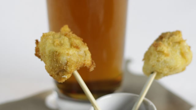 - 4Faire chauffer l'huile dans une casserole. Plonger les noix dedans deux par deux et faire frire environ 20 à 30 secondes le temps que les boules deviennent dorées. Piquer sur des petits pics en bois et servir de suite.