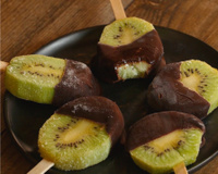 Trempez une face des rondelles de kiwis dans le chocolat fondu, en laissant l'autre face vierge. Laissez sécher le temps de tremper toutes les sucettes de la même manière.