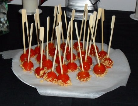 Piquer les tomates, les trempez dans de l'abricotine tiède (chauffée dans une casserole)