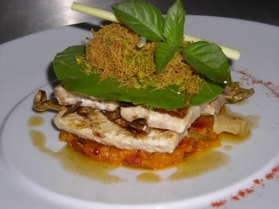 Ajouter 1 feuille de banane et la pâte a kadaïf, finir la décoration de l'assiette, selon votre envie.