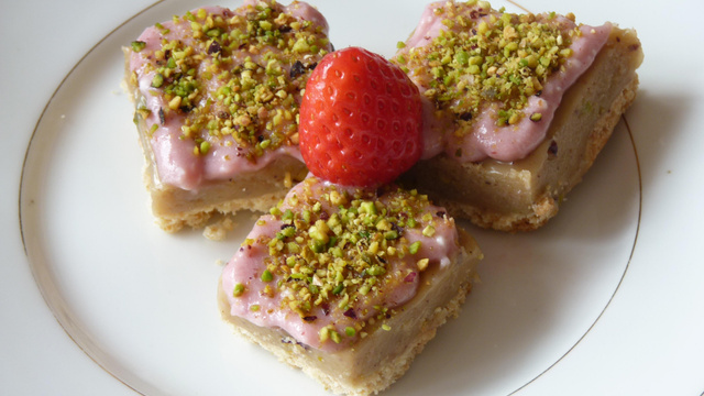 L'assemblage doit être réalisé juste avant le service. Mixer les pistaches non salées afin de les réduire en poudre. Sortir les plats contenant le shortbread et le toffee du frigo. A l'aide d'un couteau sans dent, découper 30 carrés dans l'assemblage shortbread/toffee. Garnir une poche d'une douille et la remplir du topping à la fraise. Découper le bout de la poche et garnir le dessus des bouchées de topping en formant de petites vagues. Tout le dessus de la bouchée doit être recouvert. Parsemer les bouchées de la poudre de pistaches. - 7