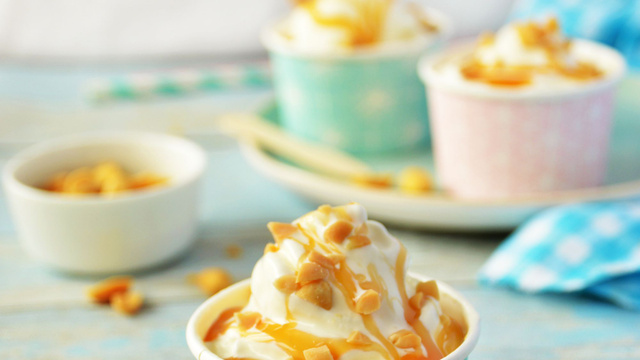 Quand la glace est prête, la répartir dans 4 coupelles. Verser un filet de caramel par-dessus et saupoudrer de cacahuètes concassées. Servir immédiatement.