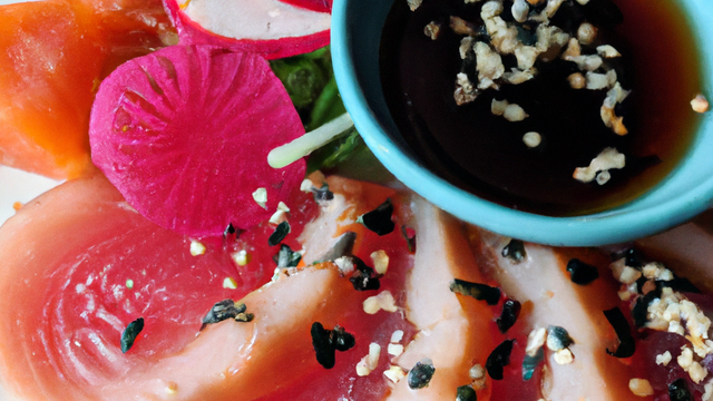 Dans un saladier, battez le vinaigre, la sauce soja, le sucre et le gingembre râpé. Émulsionnez le tout.