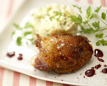 Enrobez les suprêmes dans le Floc de Gascogne, ajoutez les herbes dans la purée et servez avec le reste de Floc de Gascogne frais.