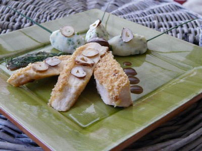 Façonner de petites quenelles et réserver au frais - 2Cuire les suprêmes au beurre clarifié et les paner avec une partie des noisettes hachée.