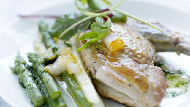 Pendant ce temps, épluchez les asperges vertes et blanches et faites-les cuire 8 à 10 min dans de l'eau bouillante salée. A l'aide d'une cuillère, déposez une quenelle de mousseline d'herbes dans l'assiette et tirez dessus et ajoutez une cuillerée de crème.