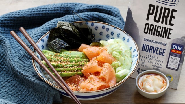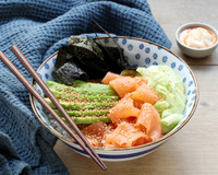 Cuisez le riz à la vapeur ou à l'eau, égouttez-le et réservez-le dans un saladier. Coupez le saumon fumé en lanières plutôt larges. Pelez et coupez l'avocat en tranches régulières. Pelez et coupez le concombre en rondelles. Coupez les oignons en rondelles. Coupez l'algue nori en lanières.