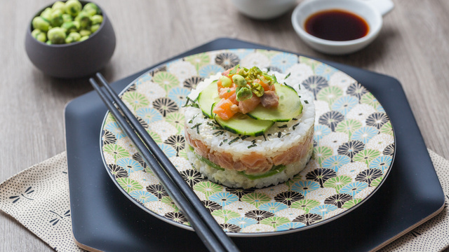 Dressez directement sur les assiettes de service à l'aide d'un emporte-pièce de 8 cm de diamètre : commencez par y déposer un disque d'algue nori puis 3 ou 4 cuillères à soupe de riz à sushis. Recouvrez de lamelles d'avocat puis du mélangez saumon/crevette. Enfin ajoutez à nouveau du riz à sushis sur le dessus. Tassez bien le tout et retirez l'emporte-pièce.