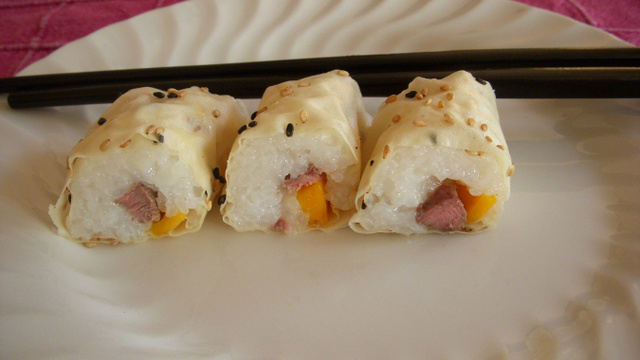 Un sushi qui mêle sucré/salé de manière subtile. Pour les fans de riz pas adeptes de poisson ni d'algue nori !