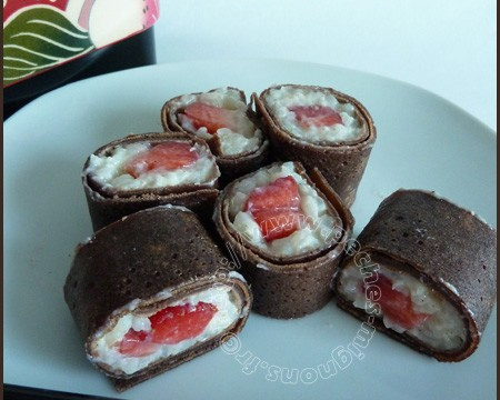 Sur la seconde moitié faites un rang de fraises ajoutez des petits bouts de menthe fraîche. Roulez peu à peu la natte vers l'avant en pressant délicatement la crêpe pour bien l'envelopper autour du riz et de la garniture. Une fois le rouleau achevé, à l'aide d'un pinceau badigeonnez le bord de miel afin qu'il colle au rouleau.