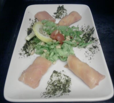 Avec un pinceau étaler le pesto d'aneth déposer les sushis de saumon mettre au centre de l'assiette la salade en chiffonnade les pignons dorer et un petit filet d'huile d'olive, ainsi qu'une tranche de citron. Bon appetit à tous.