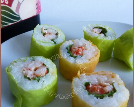 Dans un petit bol, placez la mayonnaise et ajoutez lui une petite pointe de wasabi, mélangez, goûtez et rajoutez en suivant votre goût. Une fois le riz parfaitement refroidi, déposez une feuille de soja sur un carré de latte en bambou. Répartissez une couche de riz sur la moitié de celle-ci.