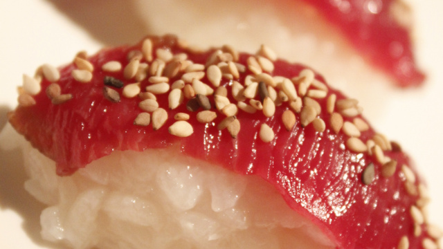 Déposer une fine tranche de boeuf sur chaque boulette de riz et saupoudrer de graines de sésame.
