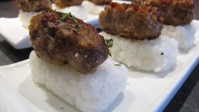 Voici une variante des sushis. J'ai posé sur le riz, des petits boudins de viande hachée caramélisés avec de la sauce soja. La viande est relevée avec du gingembre et de la coriandre.