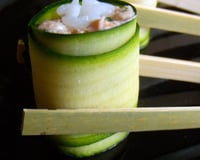 Étaler une feuille de poireau sur la natte à sushis. Étaler ensuite une fine couche de riz. Placer des lamelles de saumon et rouler le sushi. Réserver au frais.