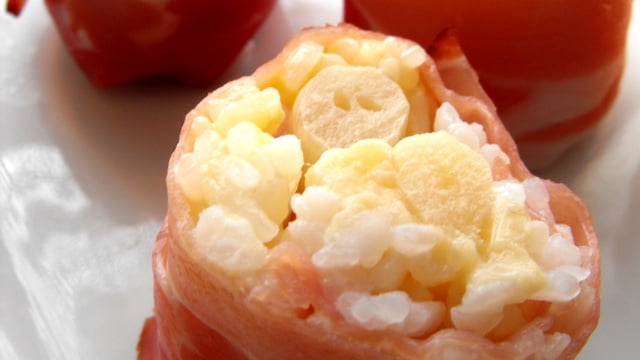 Je tapisse ma natte à sushi de papier film, y dépose dans le sens de la longueure, face à moi, une tranche de jambon cru fumé. Je tapisse le jambon de riz, je laisse 2 cm de marge côté opposé à moi.