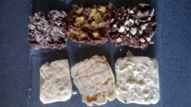 Faire fondre le chocolat de votre choix, mélanger avec les amandes, les noisettes ou les pistaches en poudre ou avec le caramel. Mettre dans de petits moules et hop frigo !