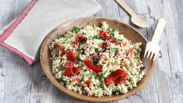 Pendant ce temps, détaillez le chou-fleur en gros bouquets et râpez l’extrémité de chaque bouquet sur une râpe à gros trous. Le résultat doit ressembler à de la graine de couscous et vous devez obtenir 500g de couscous.
