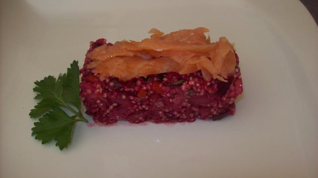 Versez la vinaigrette sur le quinoa, mélanger rectifiez l'assaisonnement. Prendre un emporte pièces de votre choix mettre le quinoa poussez et mettre le reste de saumon dessus, un peu par personne.