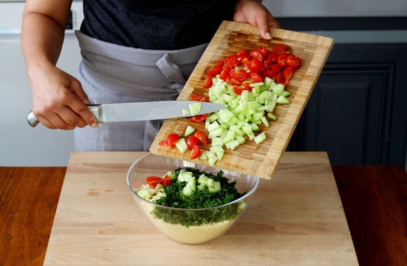 5Ajoutez les tomates et les dés de concombre à la semoule.