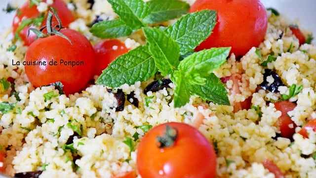 Cuire la semoule selon les instructions. Ajouter l'huile et les épices de la mer. Ajouter le persil et la menthe finement émincés. Couper quelques tomates cerise en 4 et les ajouter.