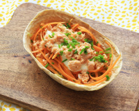 Faites chauffer les barquittas 2 à 3 minutes dans un four préchauffé à 200°C, afin de les rendre croustillantes. Détaillez la laitue iceberg en très fines lanières.