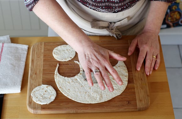 1Dans chaque tortilla, détaillez 4 cercles de 7 cm de diamètre (16 cercles).