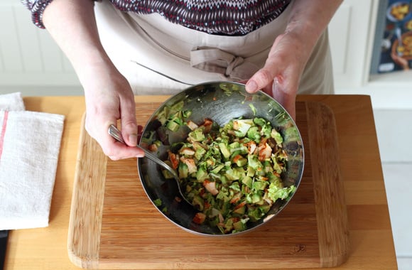 6Dans un bol, mélangez le poulet, l'avocat citronné et la laitue puis salez.