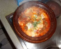 Je vous présente un tagine aux boulettes de viande hachée, décorée avec des œufs et du persil.