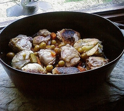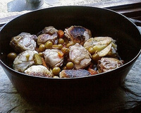 Remettre la viande, arroser de 2 verres d'eau. Saler, poivrer et ajouter des herbes aromatiques, des fruits secs, le citron confits et les olives.