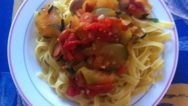 Dès que ça bout, jeter les boules de tagliatielles dans une casserole et les rondelles de courgette dans l'autre.
