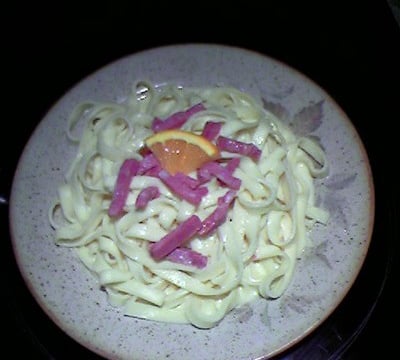 Tagliatelles accompagnées d'une sauce à l'orange et de lardons de canard fumés