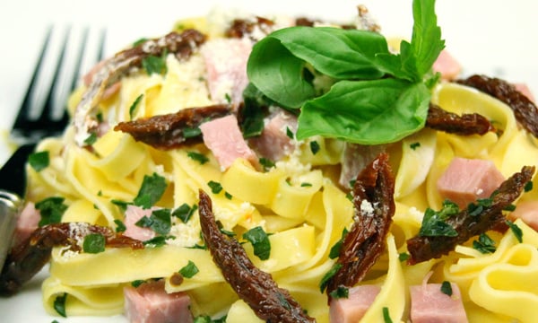 Tagliatelles au jambon, tomates séchées, basilic