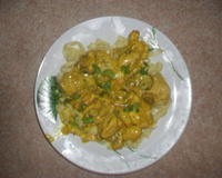Tagliatelles et émincés de poulet au curry, champignon, crème fraîche.