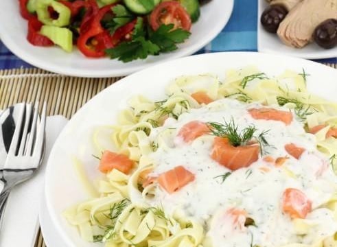 Incorporer saumon et champignons. Faire chauffer à feu doux pendant 6 minutes. Verser la sauce sur les tagliatelles.
